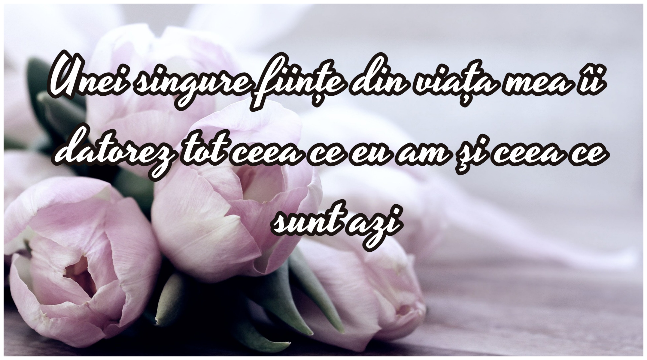 Vreau să-ţi mulţumesc pentru tot ceea ce am învăţat de la tine: cum să dăruiesc necondiţionat, cum să am încrede în mine. Tu ai fost cea care m-a iubit fără a cere nimic în schimb, tu eşti cea care mi-a oferit sprijin şi încurajări când aveam nevoie, tu ai fost mereu alături de mine când viaţa părea împotriva mea.Te iubesc, mămica mea…”„Un gând mărunt pentru iubirea imensă pe care ţi-o port.