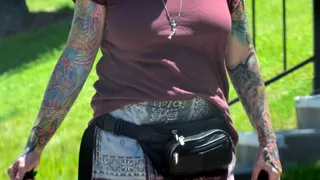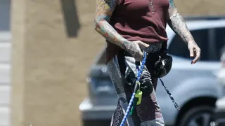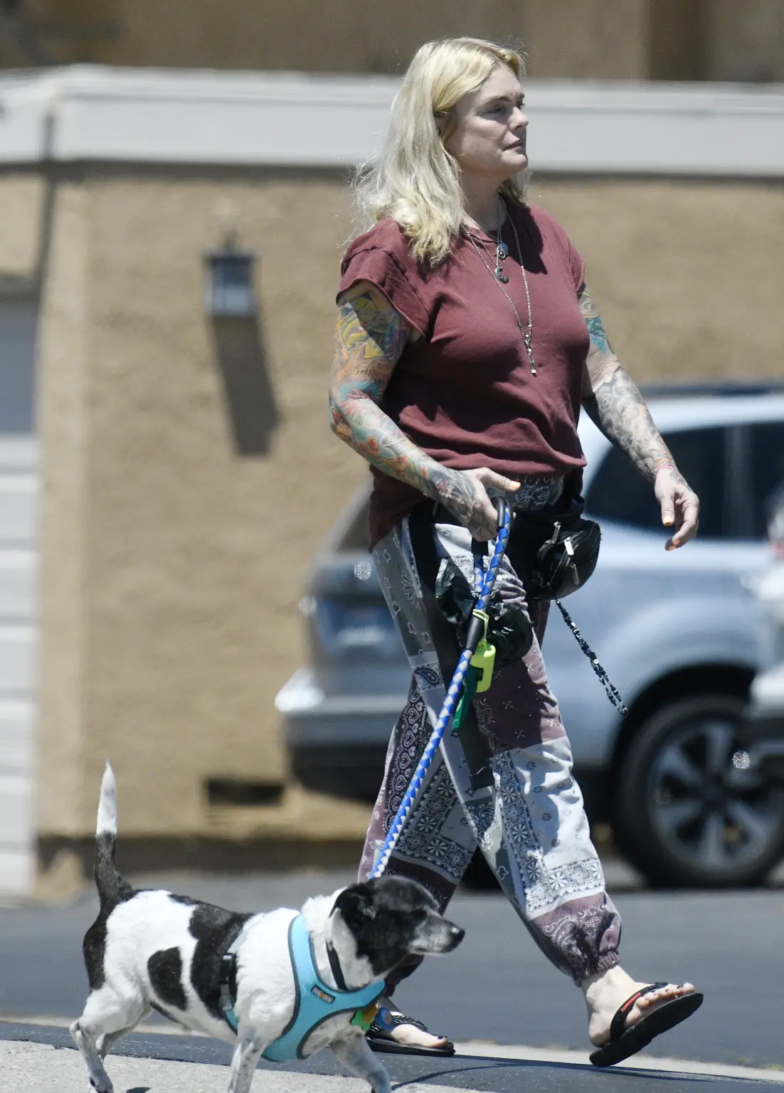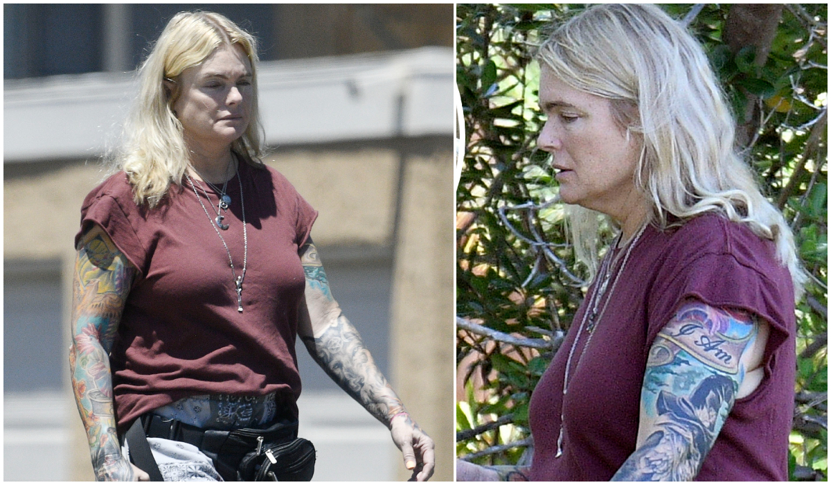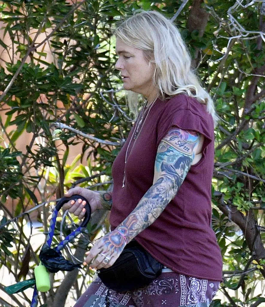 Erika Eleniak și-a arătat tatuajele impresionante în timp ce își ducea cățelul la plimbare, într-o zi însorită de iunie.