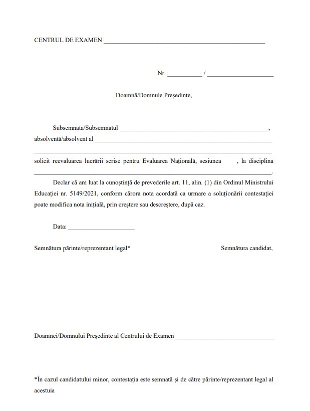 *În cazul candidatului minor, contestația este semnată și de către părinte/reprezentant legal al acestuia