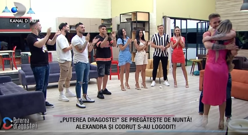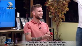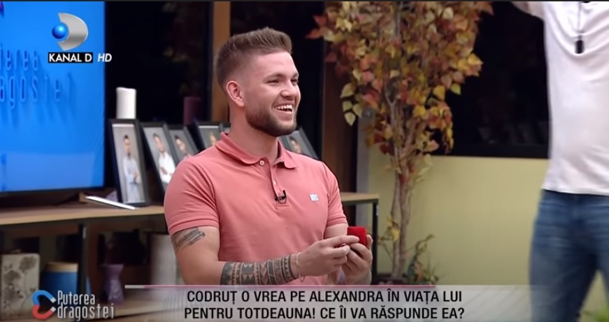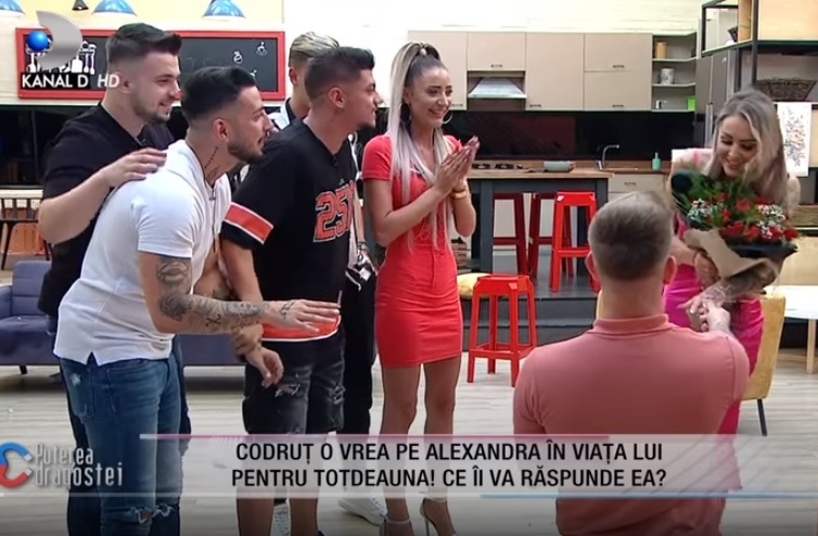 Codruț i-a pregătit o surpriză de proporții iubitei sale din emisiune, Alexandra. Concurentul de la "Puterea Dragostei" a așteptat-o pe Alexandra cu un buchet de flori, s-a așezat în genunchi cu un inel în mână și i-a adresat o cerere emoționantă, la care toți ceilalți concurenți au reacționat cu urale.