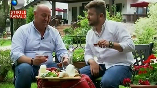 "Ia sa vedem ce-avem aici! Bine te-am gasit, Flavius! Bine ati venit la noi! Suntem in coasta Sucevei Sus, in poiana Caprioara. In poiana Caprioara, inconjurati de padure. Nu degeaba stiam eu, inca din scoala, ca ar fi cel mai impadurit judet al tarii. Mai e? Mai e, mai e… Slava Domnului!Buna afinata! Buna, buna tare! Padurile pline de afine, e sezonul lor. Imediat apar. Daca nu vii cu produse noi, reinterpretate, cu gustul bunicii, gustul de demult… lumea asta doreste. Am ajuns intr-un loc de traditie. De 24 de ani doar Flavius face turism aici, dar locul are o istorie inca si mai bogata. Are o istorie mai ampla, deoarece aici a fost o cabana de vanatoare a fostului dictator, unde venea la cate o partida, stiu eu, o data-de doua ori pe an. Ai avantajul asta ca esti, totodata, daca vrei, aproape de o mare concentrare urbana, dar daca nu, uite esti asa, izolat aici, in inima padurii. Suntem la 10 minute de centrul orasului. Si temperature e altfel, parca e un pic frigut. Intotdeauna e mai frigut la noi. Am zis ca inchinam un pahar cu vin dar pana la urma afinata a mers de minune. Nu intamplator am adus si cateva preparate traditionale reci pe masa, si vanatoresti, observ, pentru ca traditia casei asa spune, nu? Da, asa spune, suntem vanatori de multi ani.