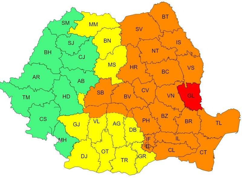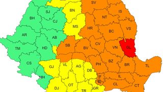 Aproape toată ţara se află, duminică și luni, sub avertizare Cod galben de ploi şi intensificări ale vântului, în timp ce în nordul şi estul Olteniei, în cea mai mare parte a Munteniei şi în sudul Transilvaniei este Cod portocaliu, fiind aşteptate ploi abundente. ANM a emis COD ROȘU de ploi pentru județul Galați, deja trecut prin indundații masive. În acelaşi timp, vremea se răceşte accentuat.