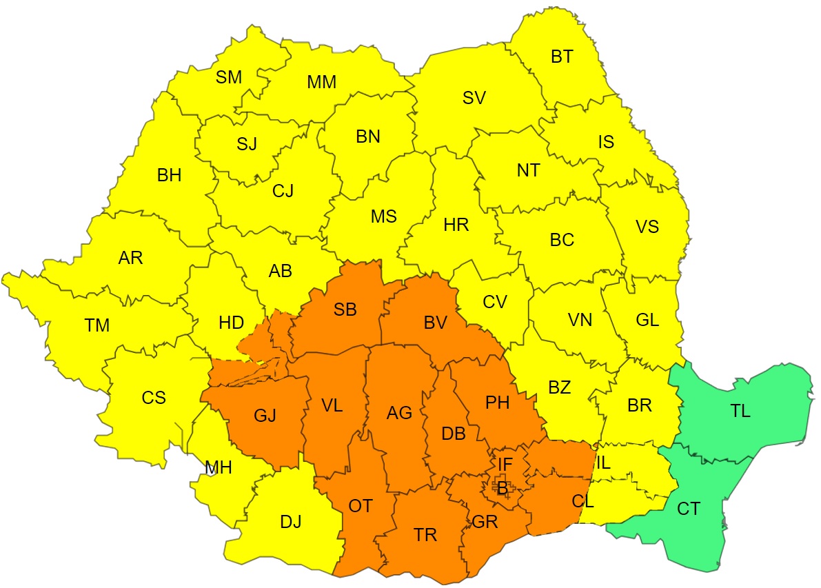 În intervalul menţionat, este Cod portocaliu de ploi torenţiale şi abundente în judeţele Sibiu, Braşov, Prahova, Dâmboviţa, Argeş, Vâlcea, Gorj, Olt, Teleorman, Giurgiu, Ilfov, Ialomiţa, Călăraşi, în municipiul Bucureşti şi parţial în judeţele Hunedoara şi Alba.