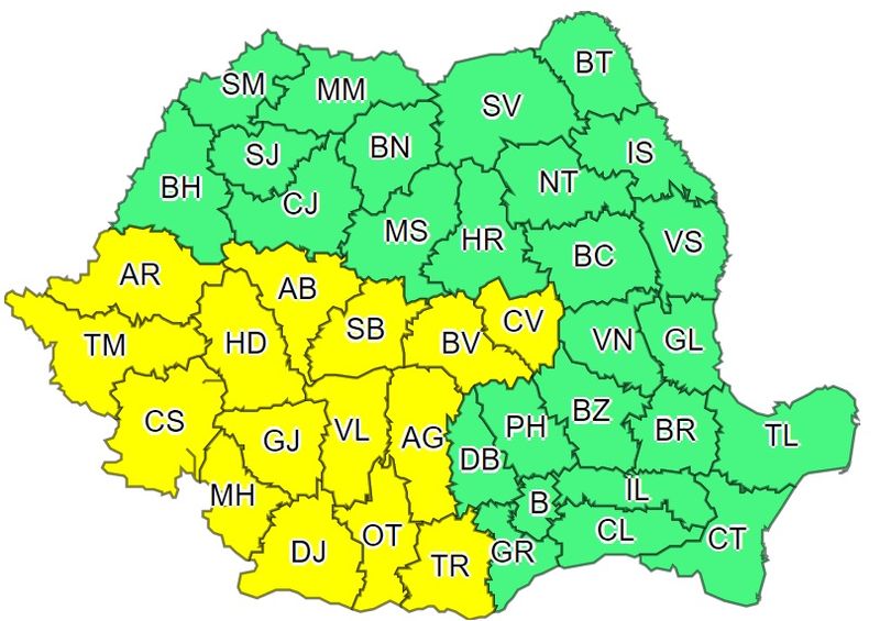 Pe parcursul zilei de joi (17 iunie) în Oltenia, vestul Munteniei, Banat, jumătatea de sud a Crișanei și a Transilvaniei vor fi perioade cu instabilitate atmosferică accentuată ce se va manifesta prin averse torențiale, frecvente descărcări electrice, vijelii și grindină.
