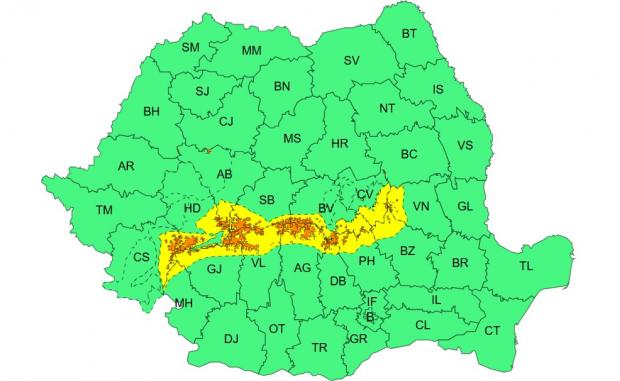 Codul portocaliu de viscol se va resimți la altitudini în general de peste 1500 m, în Carpații Meridionali și local în Carpații de Curbură, în intervalul 25 februarie, ora 20:00 – 26