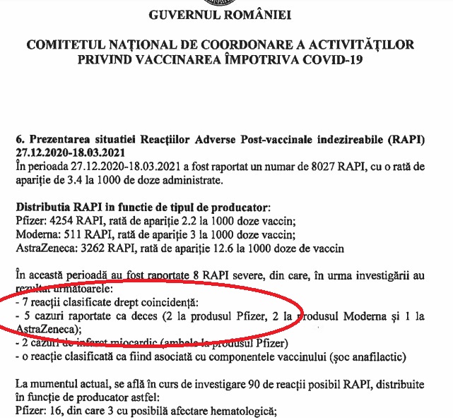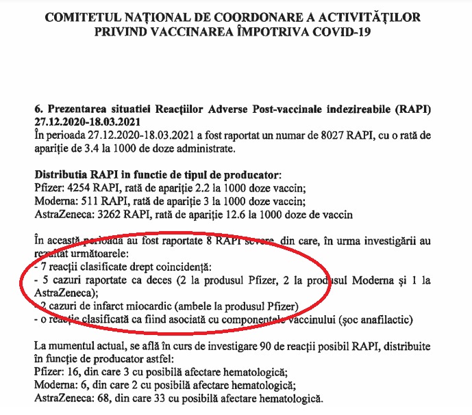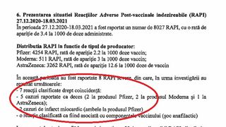 „În această perioadă au fost raportate 8 RAPI, din care, în urma investigării au rezultat următoarele:- 7 reacţii clasificate drept coincidenţă;- 5 cazuri raportate ca deces (2 la produsul Pfizer, 2 la produsul Moderna şi 1 la AstraZeneca);- 2 cazuri de infarct miocardic (ambele la produsul Pfizer);- o reacţie clasificată ca fiind asociată cu componentele vaccinului (şoc anafilactic)”. În prezent sunt în curs de investigare 90 de reacşie „posibil RAPI”, 16 în urma vaccinului Pfizer, 6 în urma Moderna şi 68 în urma AstraZeneca", se spune în nota oficială.