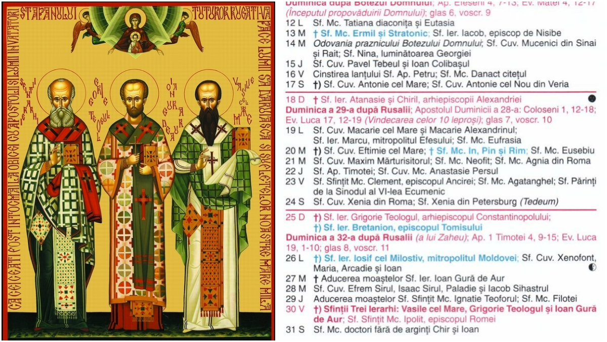 Sfinții Trei Ierarhi – Vasile cel Mare, Grigorie Teologul și Ioan Gură de Aur – au reprezentat trei dintre cele mai luminoase personalități ale creștinismului ortodox. Aceștia sunt prăznuiți pe data de 30 ianuarie, în Calendarul ortodox. Sărbătoare este marcată cu cruce roșie. Prin viața lor aleasă, prin învățăturile teologice profunde și prin lucrarea pastorală, ei au contribuit decisiv la formularea și apărarea dreptei credințe, fiind considerați stâlpi ai Bisericii și modele de slujire creștină.