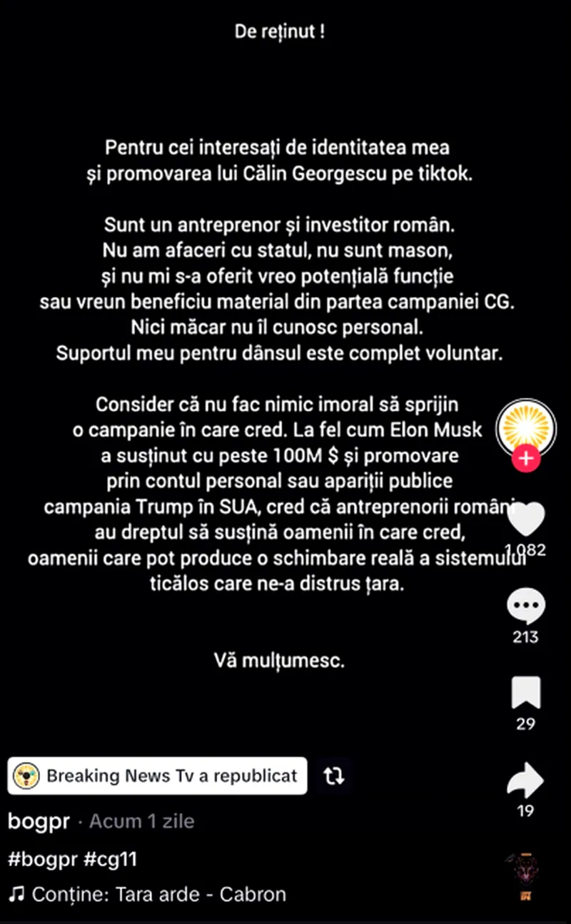 ”Pentru cei interesați de identitatea mea și promovarea lui Călin Georgescu pe Tiktok.
