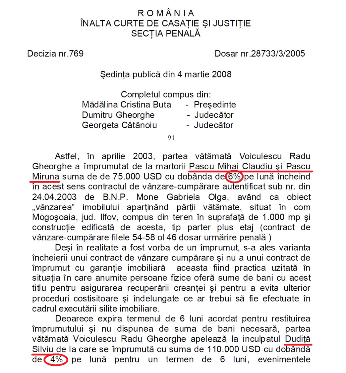 „În aprilie 2003, partea vătămată Voiculescu Radu Gheorghe a împrumutat de la martorii Mihail Pascu Claudiu şi Pascu Miruna suma de de 75.000 USD cu dobânda de 6% pe lună încheind în acest sens contractul de vânzare-cumpărare”, scrie