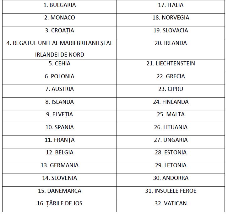 Lista țărilor membre ale Uniuniii Europene și Spațiului Economic European pentru care nu se recomantă intrarea în izolare/carantină a persoanelor care sosesc în România:
