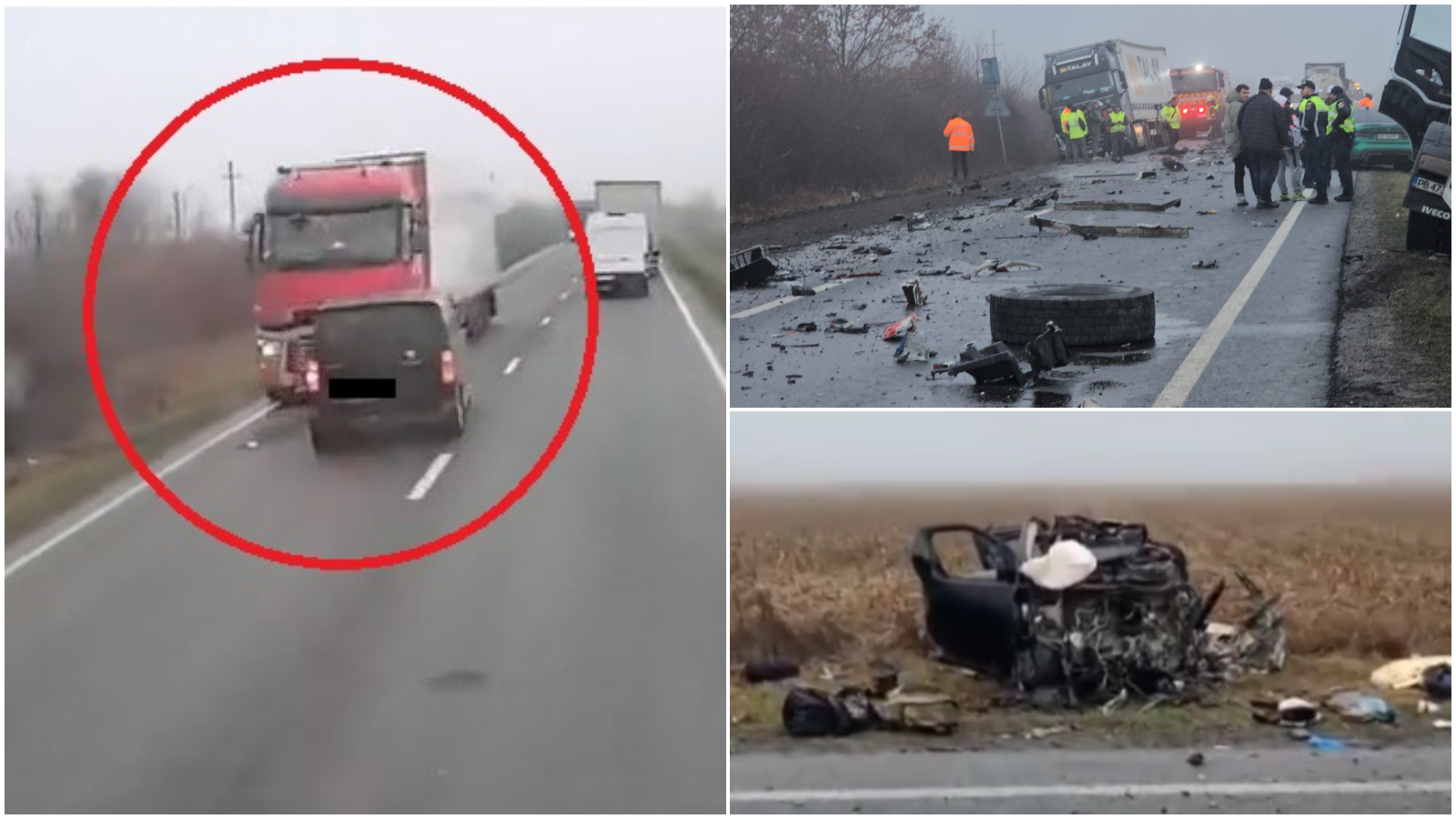 Amintim că accidentul s-a produs în momentul în care șoferul microbuzului a intrat în depășire, momnt în care s-a lovit de un TIR care venea din sens opus. Momentul impactului a fost surprins, iar imaginile sunt cutremurătoare.
