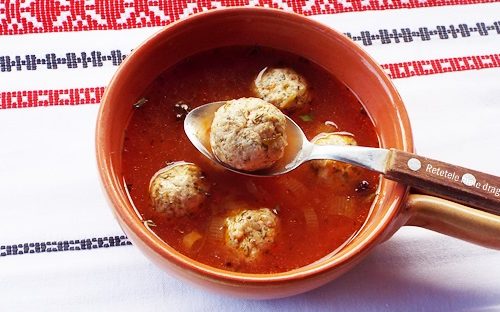CIORBĂ DE PERIŞOARE reţetă. Umezim mainile si formam perisoarele -bile de dimensiunea unei nuci. Se micsoreaza focul si punem perisoarele in supa. Lasam la fiert cca 10 min, timp in care avem grija sa indepartam spuma formata.