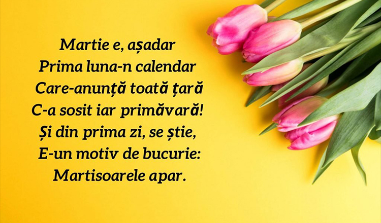„Din departari, pe aripi nestiute, purtat de un dulce si mirific dor, in cea mai minunata primavara, se indreapta catre tine un Martisor!”.