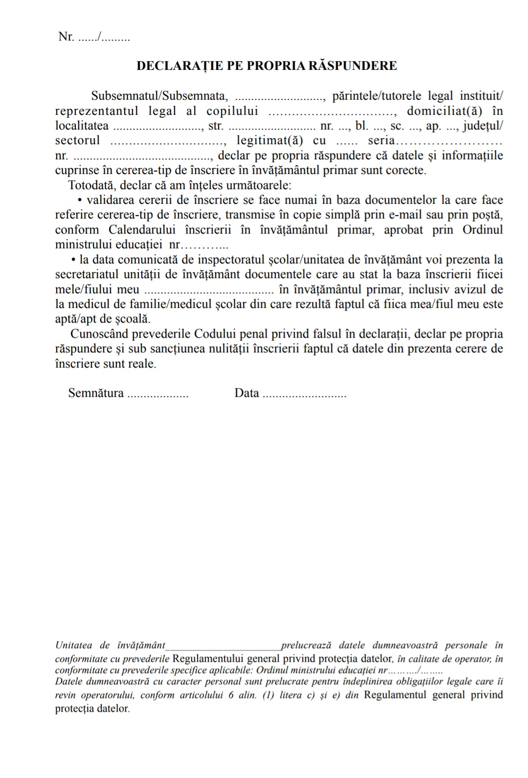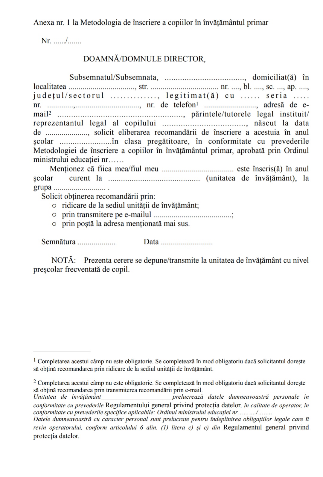 Pentru înscrierea copiilor în clasa pregătitoare, părintele va completa o cerere-tip, online sau la unitatea de învățământ la care solicită înscrierea, în perioada 11 aprilie-10 mai 2022, după cum se arată în ordinul publicat în Monitorul Oficial. Cererea-tip apare, de regulă, după publicarea metodologiei de către Ministerul Educației.
