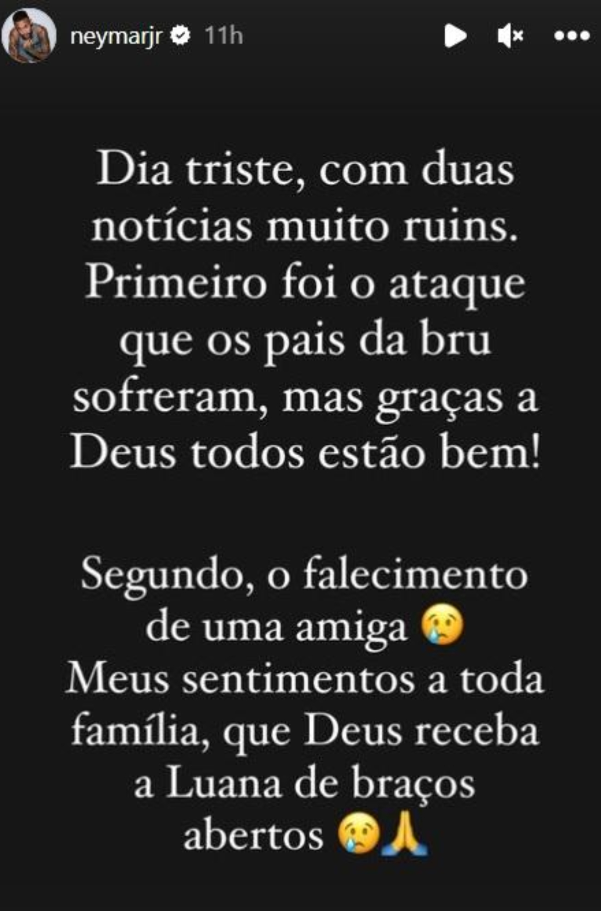 "Azi dimineață, hoții mi-au jefuit casa și mi-au luat părinții ostatici. Eu, Mavie și sora mea nu mai locuim acolo și noi nu eram în acel moment în casă. Slavă Domnului că totul este în regulă cu ei. Lucrurile materiale le putem recâștiga. Este important că toată lumea este bine și că cei implicați au fost găsiți. Îți mulțumesc, Doamne, că ai grijă de mine și că mi-ai protejat mereu familia de orice rău", a scris iubita lui Neymar.