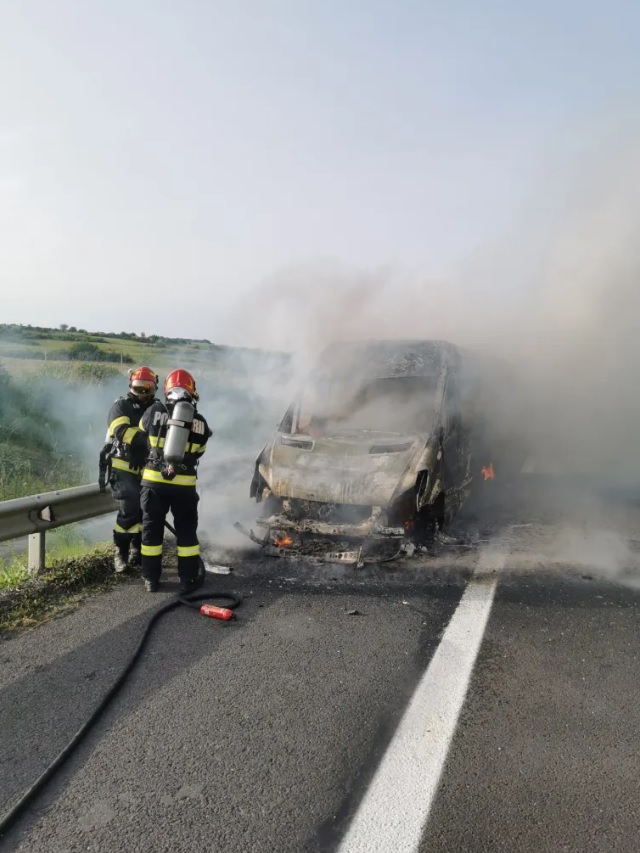 „Pompierii militari sibieni au intervenit de urgenţă pe A1 km 276 sensul de mers Sebeş- Sibiu pentru stingerea unui incendiu de autovehicul.