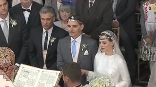 In aceste momente are loc slujba de cununie. Cei doi sunt vizibil emotionati si isi zambesc incontinuu. La un moment dat, fostul principe i-a soptit ceva sotiei sale la ureche, apoi a zambit.