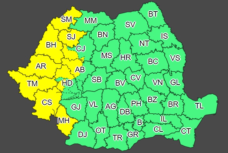 Izolat va cădea grindină, iar cantităţile de apă vor depăşi 25- 30 litri/mp şi izolat 40 litri/mp. Judeţele aflate sub atenţionare Cod galben sunt: Satu Mare, Sălaj, Alba, Cluj, Hunedoara, Mehedinţi, Caraş-Severin, Timiş, Arad şi Bihor.