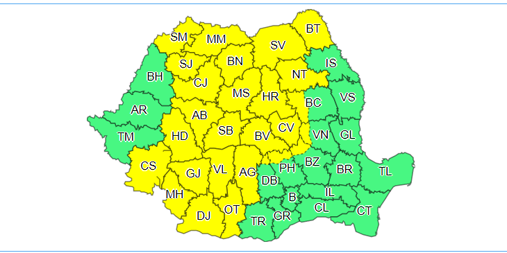Meteorologii au extins, luni, codul galben de instabilitate atmosferică, doar opt judeţe din ţară rămânând în afara ariei de manifestare a fenomenelor periculoase.
