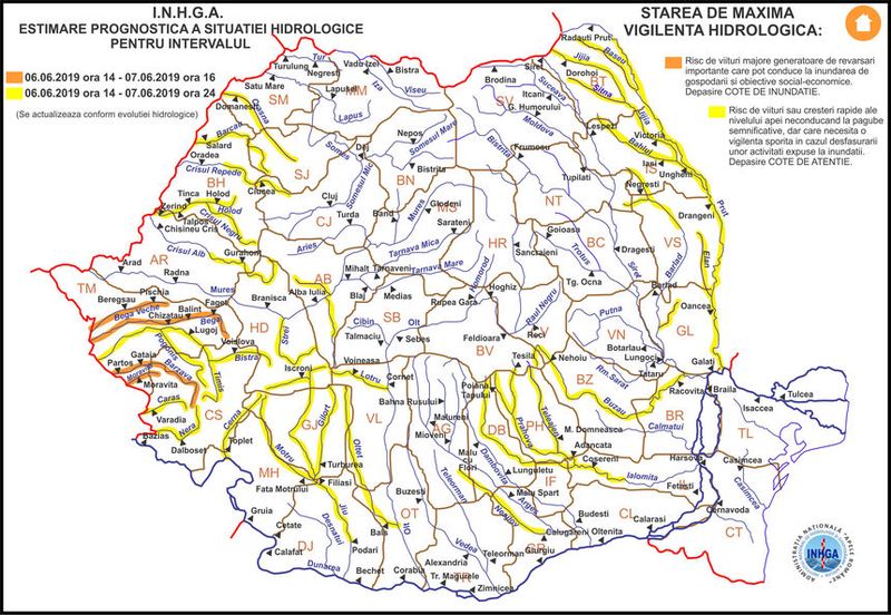 Cod galben de inundaţii. Potrivit hidrologilor, pot apărea inundaţii în bazinele hidrografice Crasna, Barcău, Crişul Repede, Crişul Negru, Crişul Alb, Mureş, Bega Veche, Bega, Timiş, Bârzava, Moraviţa, Caraş, Nera, Cerna, Jiu, Olt, Argeş, Ialomiţa, Buzău, Bârlad, Prut, afluenţii mici ai Dunării amonte acumularea Porţile de Fier II.