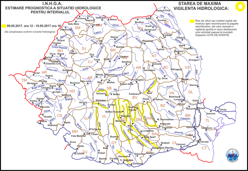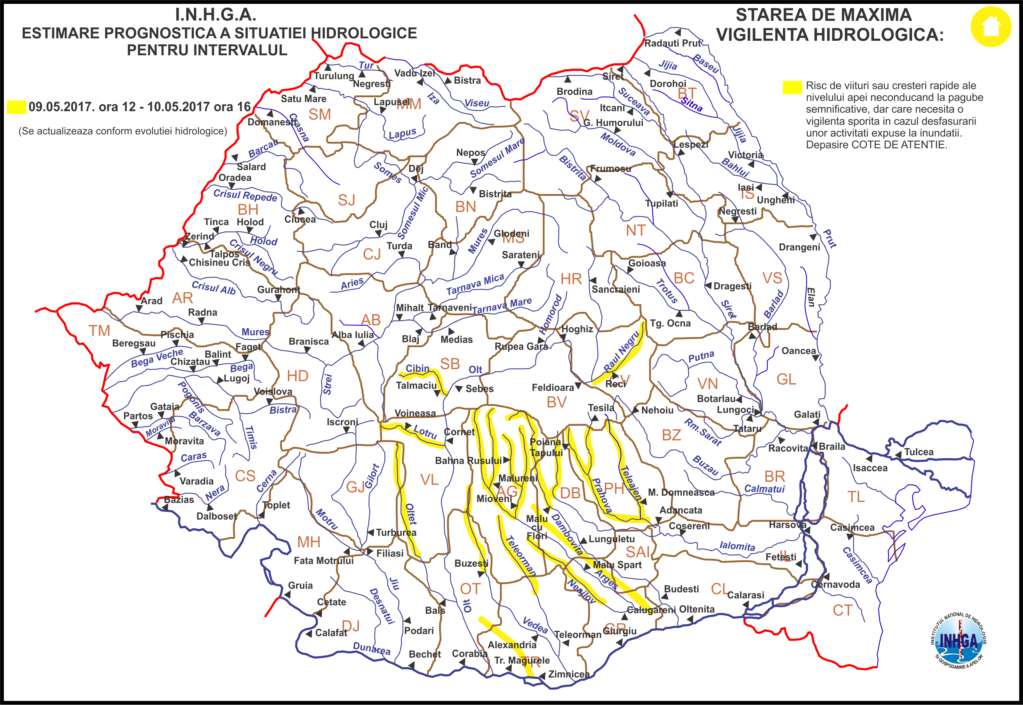 Atentionarea hidrologilor este valabila in intervalul 09.05.2017 ora 12:00 – 10.05.2017 ora 16:00, pe raurile din bazinele hidrografice: afluentii Oltului din judetele: Covasna, Brasov, Sibiu, Valcea, Gorj, Arges, Olt si Dolj, Calmatui, Vedea- bazin superior si afluenti bazin mijlociu (judetele Arges, Olt si Teleorman), Arges- bazin superior si afluenti bazin mijlociu si inferior (judetele: Arges, Dambovita, Teleorman, Giurgiu, Ilfov), Ialomita-bazin superior si Prahova si afluentii sai (judetele Dambovita si Prahova).