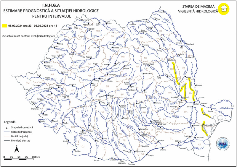 Conform Institutului Național de Hidrologie și Gospodărie a Apelor, codul galben de inundații este valabil de joi, de la ora 23:00, și până vineri, 6 septembrie, la ora 18:00.