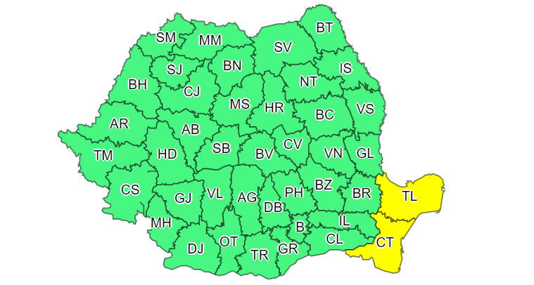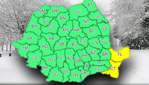 Administraţia Naţională de Meteorologie (ANM) a emis, miercuri, o atenţionare Cod galben de precipitaţii moderate cantitativ predominant sub formă de ninsoare şi intensificări ale vântului, valabilă de miercuri seara până joi după-amiaza, în judeţele Tulcea şi Constanţa.