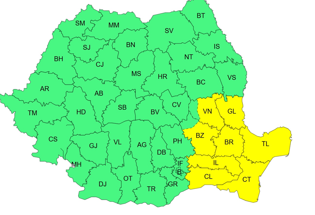 De sâmbătă, 21 decembrie, de la ora 03:00, intră în vigoare un cod galben de intensificări ale vântului. Codul galben vizează sudul Moldovei, jumătatea estică a Munteniei și Dobrogea și este valabil până duminică, la ora 10:00: „În sudul Moldovei, jumătatea estică a Munteniei și în Dobrogea vântul va avea intensificări cu viteze în general de 55…70 km/h.”