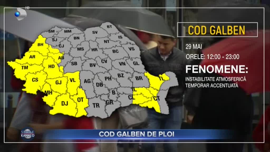 Stirea "Cod galben de ploi" difuzata in cadrul grupajului informativ Știrile KANAL D din 29 May 2023.