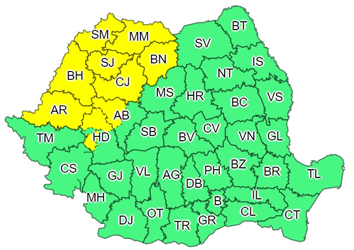 Judeţele vizate de atenţionarea Cod galben sunt: Alba, Arad, Bihor, Bistriţa-Năsăud, Cluj, Hunedoara, Maramureş, Sălaj şi Satu Mare.