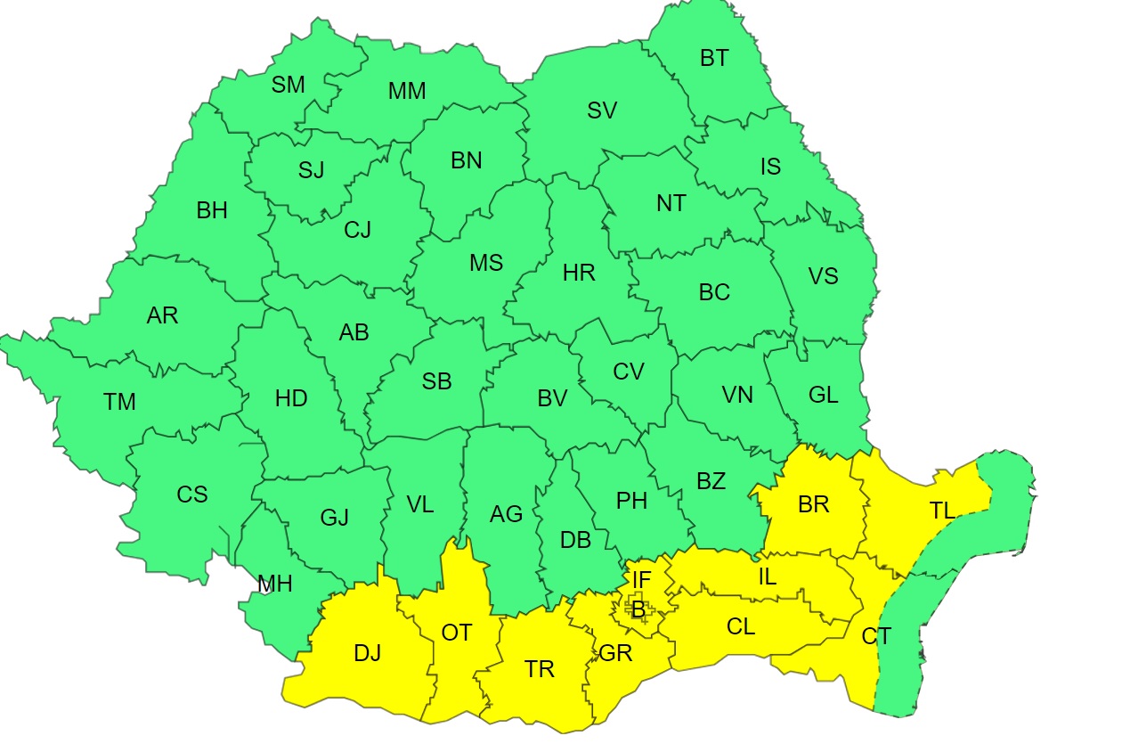 În același timp, meteorologii au emis și un cod galben de caniculă. Este vorba despre un val de caniculă și disconfort termic ridicat, care vizează în special sudul țării.