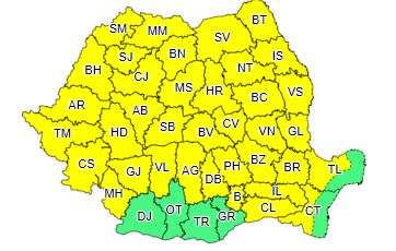 ANM a emis şi o atenţionare Cod galben de instabilitate atmosferică temporar accentuată şi cantităţi însemnate de apă, pentru miercuri, între orele 12.00 şi 23.00, valabilă în aproape toată ţara.