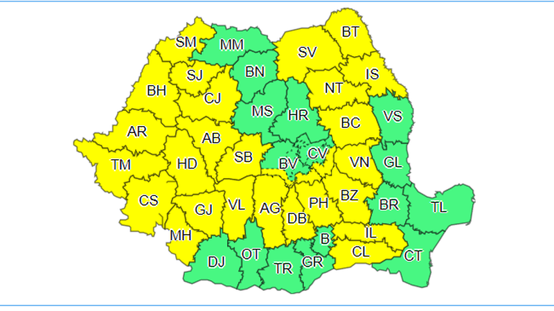 Totodată, aceştia au emis o o avertizare cod galben, valabilă miercuri, până la ora 23.00, în Banat, Crişana, vestul şi sud vestul Transilvaniei, nordul Olteniei, vestul şi nordul Moldovei, nordul şi estul Munteniei, precum şi în zonele de munte.