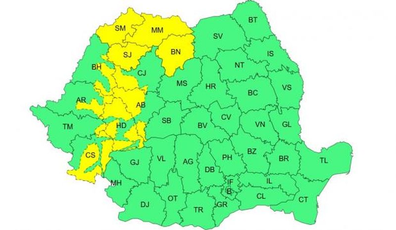 Meterologii anunță aceste fenomene în intervalul 23 februarie, ora 10:00 – 24 februarie, ora 10:00, în Caraș-Severin, Hunedoara, Timiș, Arad, Alba, Bihor, Satu Mare, Sălaj, Maramureș, Cluj și Bistrița-Năsăud. Vântul va sufla cu viteze de 60-90 km/h, vizibilitatea va scădea sub 100 de metri, se vor acumula precipitații de 20-30 l/mp și se va depune la munte un strat de zăpadă