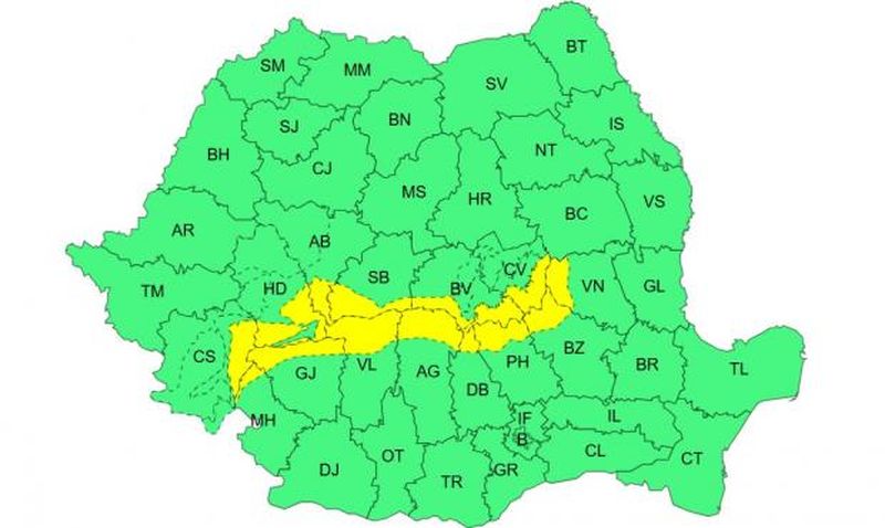 Aceasta avertizare este valabilă în intervalul 24 februarie, ora 20:00 – 25 februarie, ora 10:00, pentru Carpații Meridionali și Carpații de Curbură, unde vântul va suflacu viteze de 60-85 km/h, iar la altitudini de peste 1700 m, rafalele vor atinge 90-110