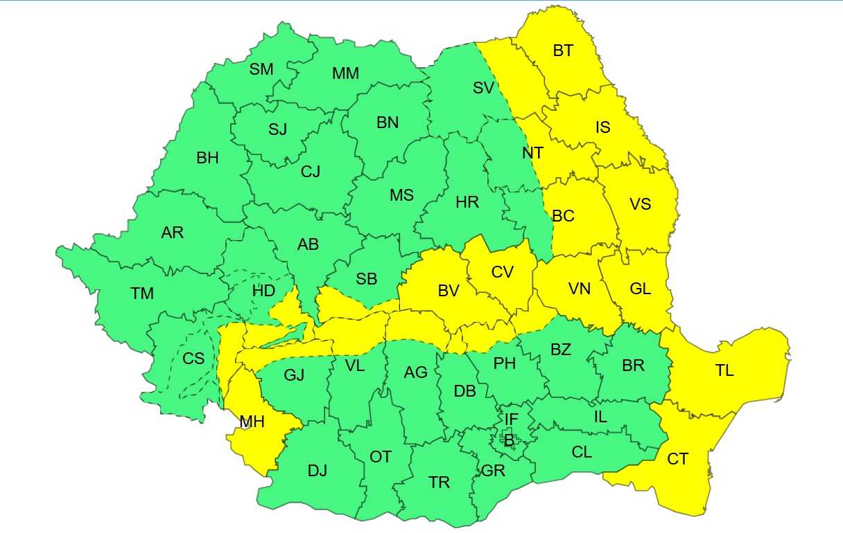 Administrația Națională de Meteorologie a emis cod galben de vânt în 22 de județe din țară. Codul este valabil sâmbătă, 11 octombrie, și aduce intensificări ale vântului și rafale în Vrancea, Botoşani, Iaşi, Vaslui, Galaţi, Tulcea, Constanţa, Covasna, Braşov, Mehedinţi, integral, şi, parţial, Suceava, Neamţ, Bacău, Buzău, Prahova, Argeş, Dâmboviţa, Sibiu, Vâlcea, Hunedoara, Caraş-Severin şi Gorj.