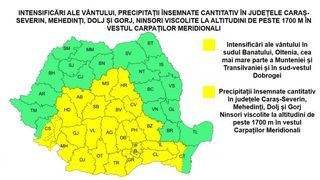 Iar în județele Caraș-Severin, Mehedinți, Dolj și Gorj, tot vineri de la 05:00 la 22:00 sunt anunțate precipitații însemnate cantitativ, de 20-30 l/mp local, iar în vestul Carpaților Meridionali, la altitudini de peste 1700 m, va ninge viscolit, ceee ce va face ca stratul de zăpadă să ajungă
