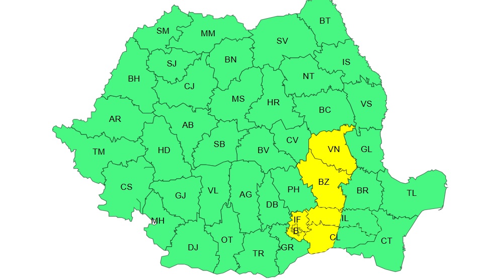 Codul de vânt puternic, valabil inițial pânâ vineri, 20 martie, ora 18:00, a fost extins până sâmbătă, 21 martie, ora 18:00. Rămân sub codul galben de vânt puternic Vrancea, Buzău, Ialomița, Călărași, iar prognoza se extinde și în Ilfov și București. Rafalele de vânt pot ajunge până la 65-75 km/h.