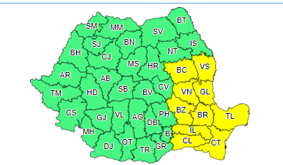 , a transmis ANM.Avertizarea este valabilă în judeţele Bacău, Brăila, Buzău, Călăraşi, Constanţa, Galaţi, Ialomiţa, Tulcea, Vrancea şi Vaslui.