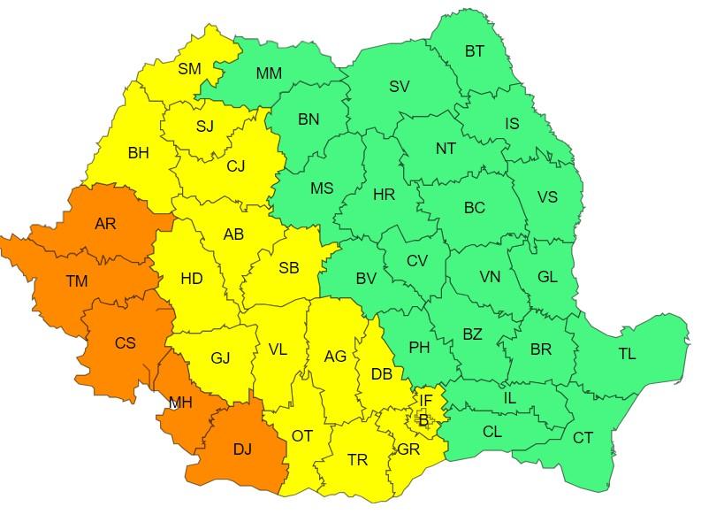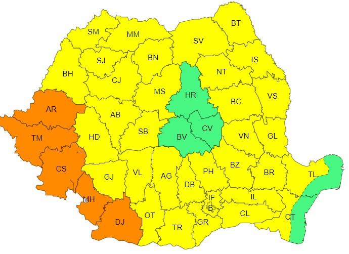 Codul portocaliu este înregistrat în „județele Arad, Timiș, Caraș-Severin, Mehedinți și Dolj canicula se va intensifica, disconfortul termic va fi accentuat, iar indicele temperatură-umezeală (ITU) va atinge pragul critic de 80 de unități. Temperaturile maxime, deosebit de ridicate pentru această dată, se vor situa în jurul a 37 de grade, iar minimele vor fi de 18...20 de grade, valori ușor mai mari, în jurul a 23 de grade, urmând a se înregistra în Dealurile de Vest.”