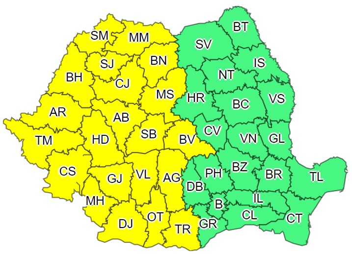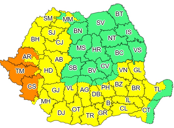 Administrația Națională de Meteorologie (ANM) a emis noi avertizări cod galben și cod portocaliu de vreme extremă pentru acest weekend. Vezi mai jos HARTA județelor afectate de avertizările meteo.