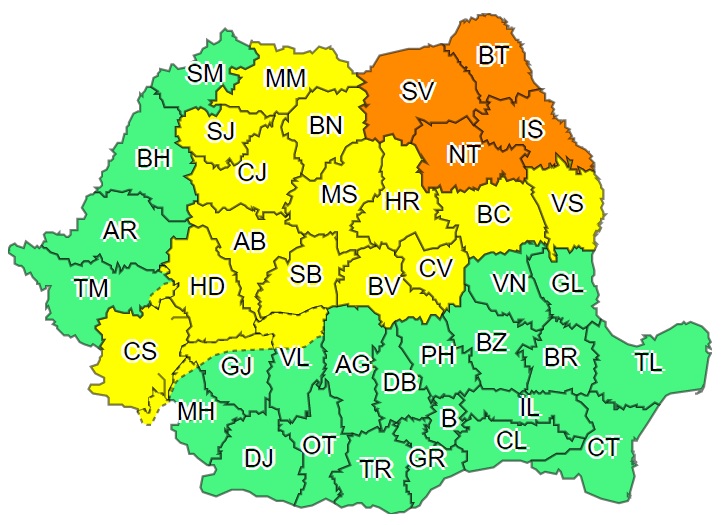 Jumătate din țară se află sub avertizare de vreme rea. Codul portocaliu este valabil pentru 4 județe din nord-estul țării, iar Codul galben de ploi afectează 16 județe din Transilvania și Moldova.