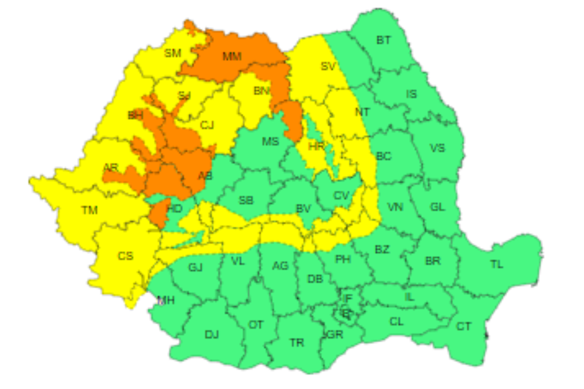 Meteorologii ANM au emis un cod portocaliu de ploi torențiale în mai multe zone din nordul țării. În regiunile montane din Maramureș și zona montană din Bistrița Năsăud, Mureș, Bihor, Arad, Hunedoara, Alba, Cluj, Sălaj și Satu Mare, va ploua torențial. Cantitatea de precipitații va fi de 50-70 l/mp. Izolat, cantitatea de apă ar putea depăși 80 l/mp.