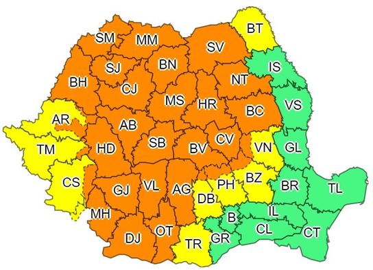 Tot în această dimineață a intrat în vigoare un cod galben de ploi torențiale, valabil de asemenea până pe 2 septembrie, ora 21.00. Cantitățile de apă vor depăși 25-40 l/mp și pe alocuri vor fi descărcări electrice, intensificări de scurtă durată ale vântului și grindină.