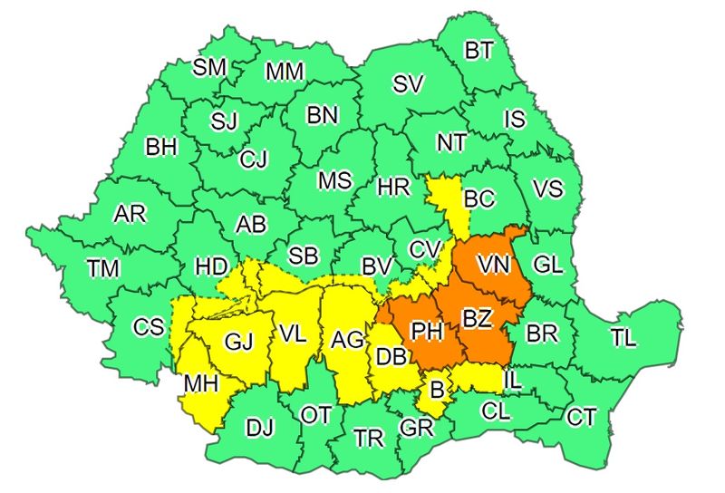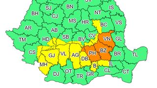 Meteorologii au emis marţi o avertizare cod portocaliu de precipitaţii abundente pentru judeţele Prahova, Buzău, Vrancea şi în zona montană din judeţul Dâmboviţa, valabilă până miercuri seară. Vezi HARTA