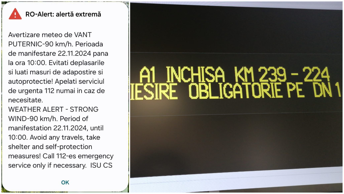Rafalele depășesc 120 km/h, forță suficientă pentru a răsturna chiar și mașini de mare tonaj. Din acest motiv, autoritățile au decis închiderea traficului pe un tronson al autostrăzii A1, din județul Sibiu, chiar la intrarea spre Valea Oltului. Sute de mașini sunt blocate acum în plină vijelie, pe drumul național de la intrarea în autostradă.