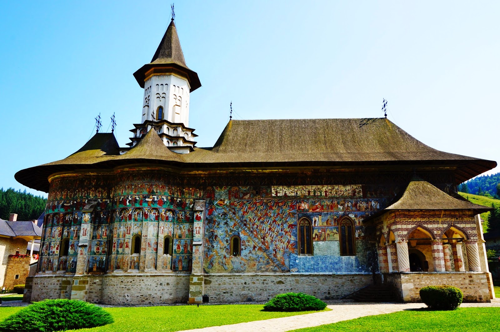 Pictura exterioară abundă în nuanțe de galben-auriu și verde, cu scene ample precum Asediul Constantinopolului. Această mănăstire reflectă idealul de frumusețe spirituală și putere culturală a epocii medievale moldovenești.