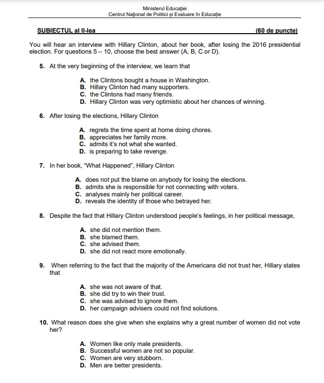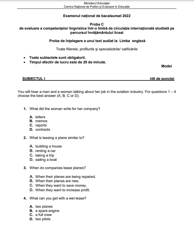 Mai multe modele de subiecte pentru evaluarea competențelor lingvistice într-o limbă de circulație internațională, puteți găsi accesând site-ul oficial edu.ro.