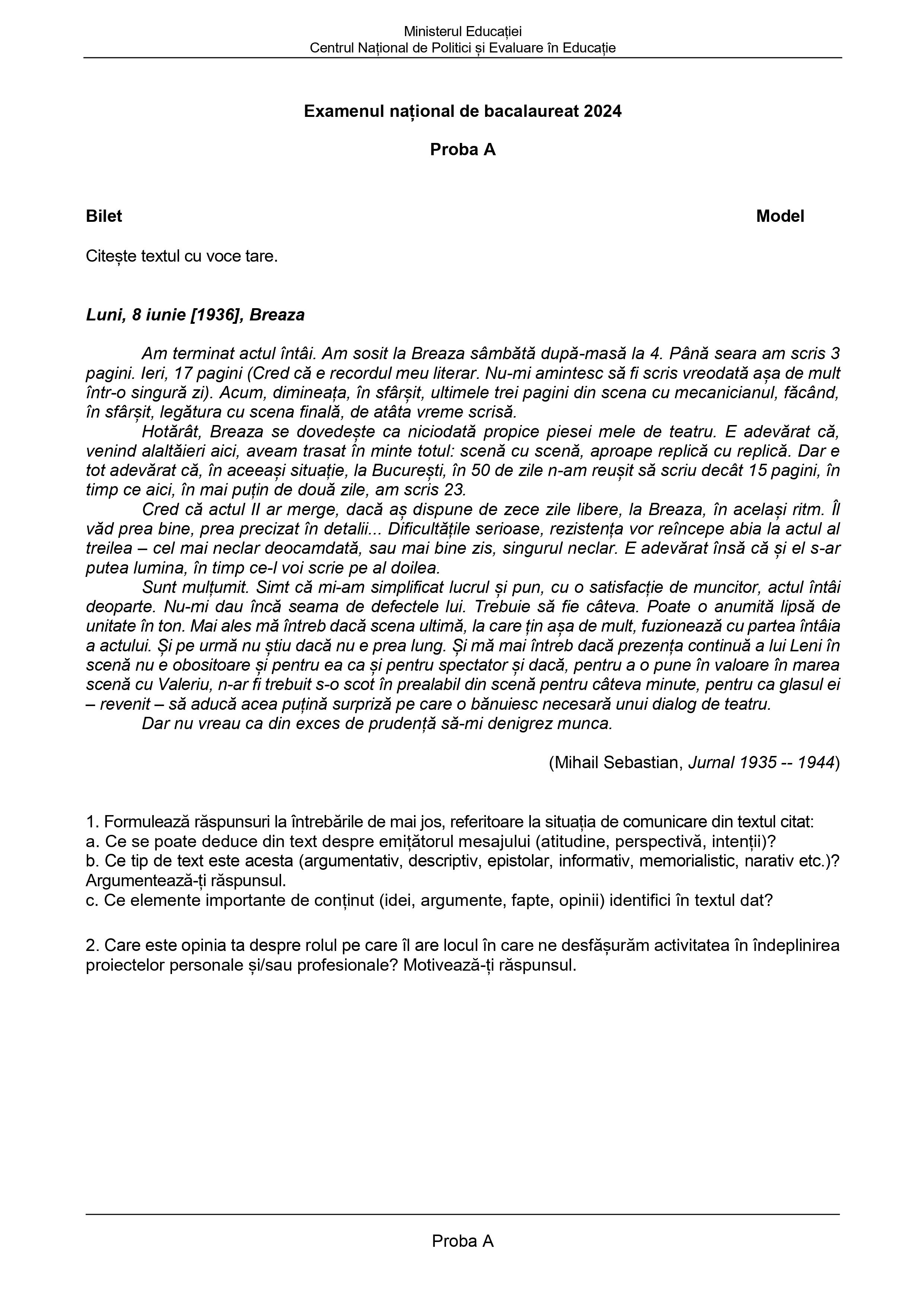 Examenul național de Bacalaureat 2024- Proba A- Model subiecte competențe Română BAC 2024: