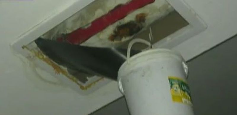 Un medic confirma situatia: „S-a infiltrat apa de ploaie, a distrus rigipsul şi, din nefericire, cineva a avut ideea sa colecteze în aceasta galetuşa, sa nu picure pe pat”.